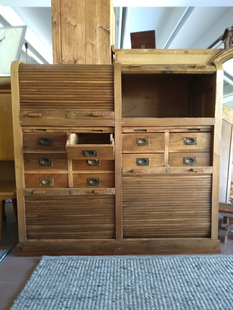vecchio mobile archivio a cassetti restaurato diviso in 4 parti con serrande scorrevoli chiudibili a chiave. largo 136 cm, alto 145 cm, profondo 60 cm.